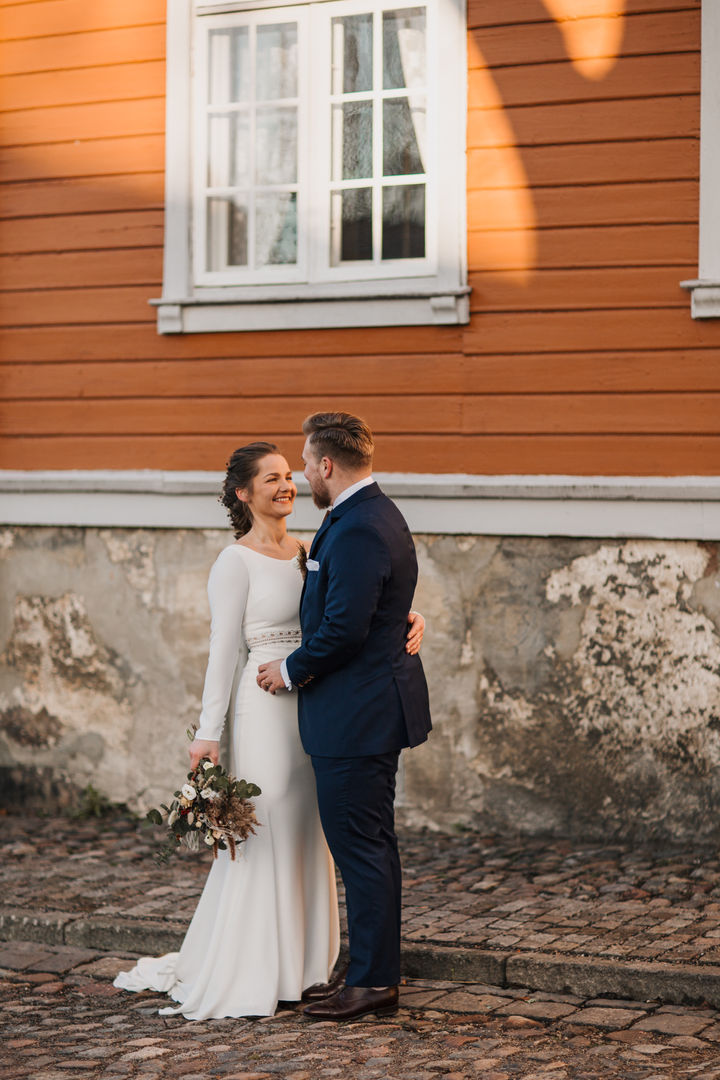Korona satte ikke stopper for dette nydelige januarbryllupet i gamlebyen i Fredrikstad. Vintersolen var skarp og lå lavt på himmelen så det var fint å ta portrettfotograferingen i Gamlebyen der de vakre husene og fargene skapte fine rammer rundt paret.